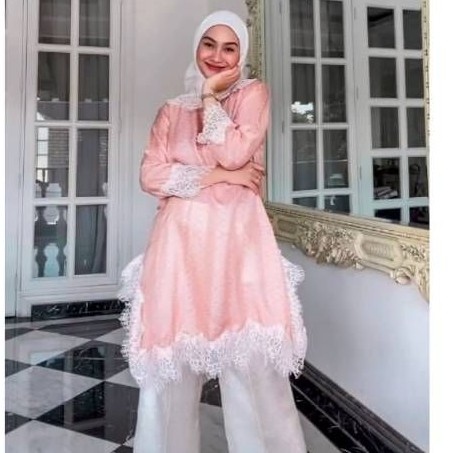 Detail produk : Tunik Set dengan detail renda di bagian leher, samping, dan kanan